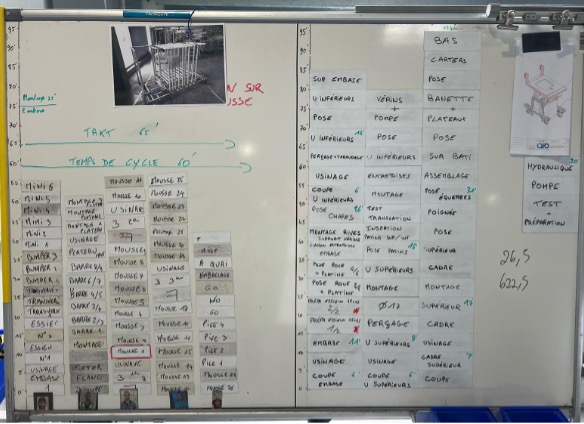 Talking about dojos and regular training, Olivier from AIO is now showing us their U-shaped cell, driven by a kanban, and how a manual yamazumi board is used to balance the work between workstations, before launching the assembly of a new karakuri kaizen. Every task has standards, with times precisely measured, and operators participate in two daily dojos to sharpen their skills.