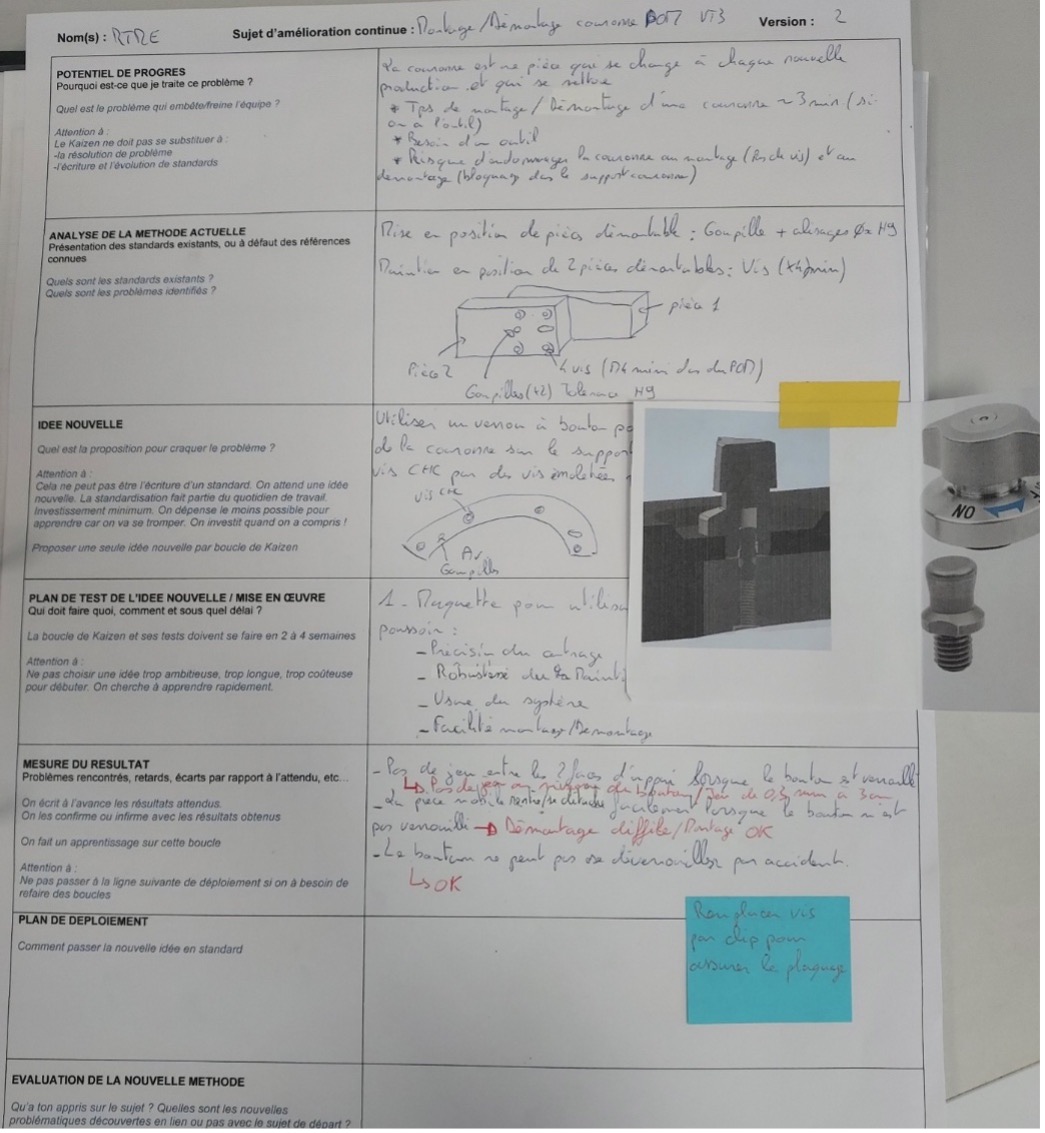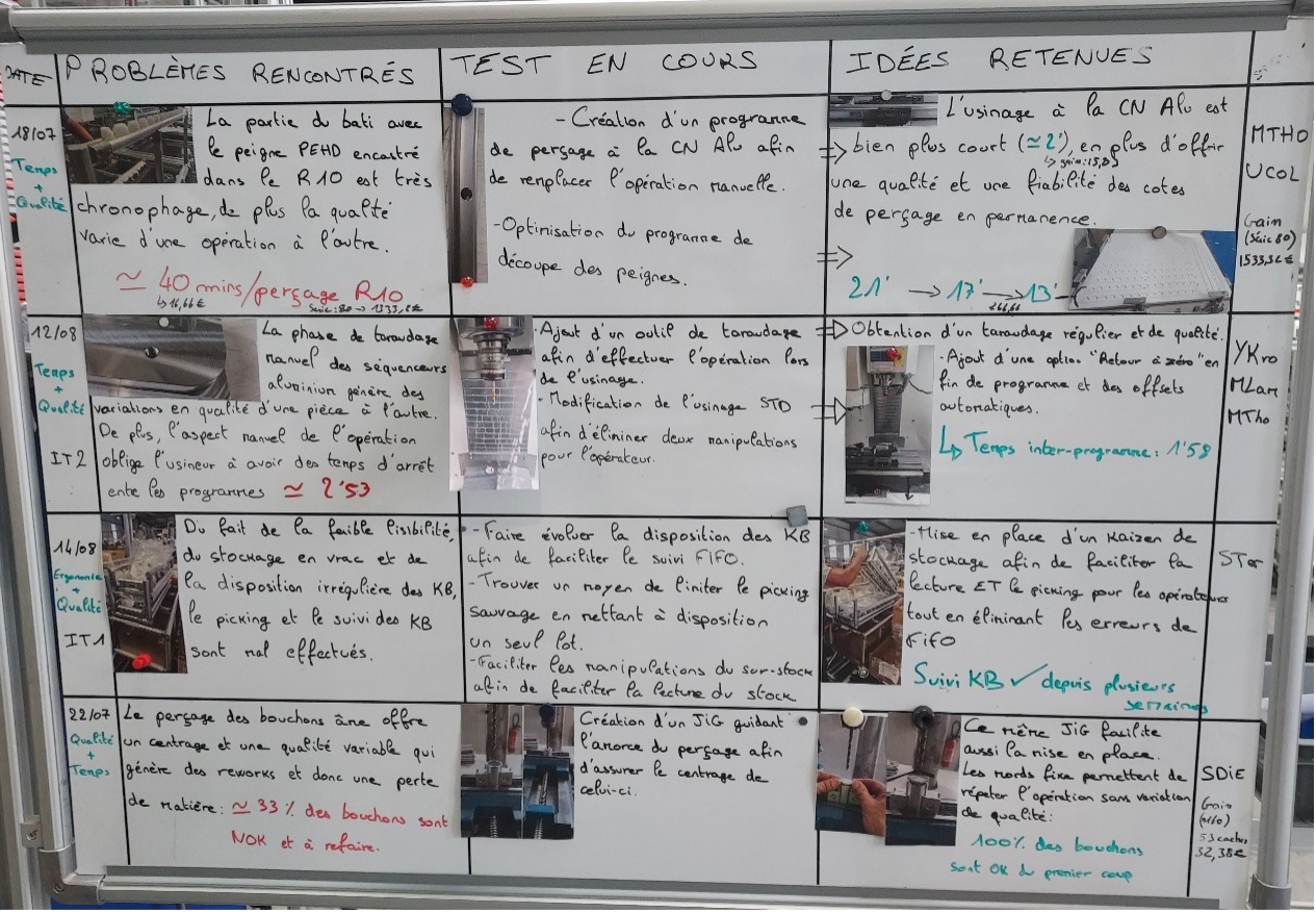 This goes further than stimulating the operators’ creativity and implementing devices like poka yoke, seconded by engineering if need be. Olivier himself leads those weekly sessions, and they have become a great opportunity to challenge and improve the design of the catalogued products or to facilitate their assembly. I can see nearby on a board the finetuning of a karakuri customization, where Engineering and Production collaborated to stabilize the quality before delivering it to the customer.
